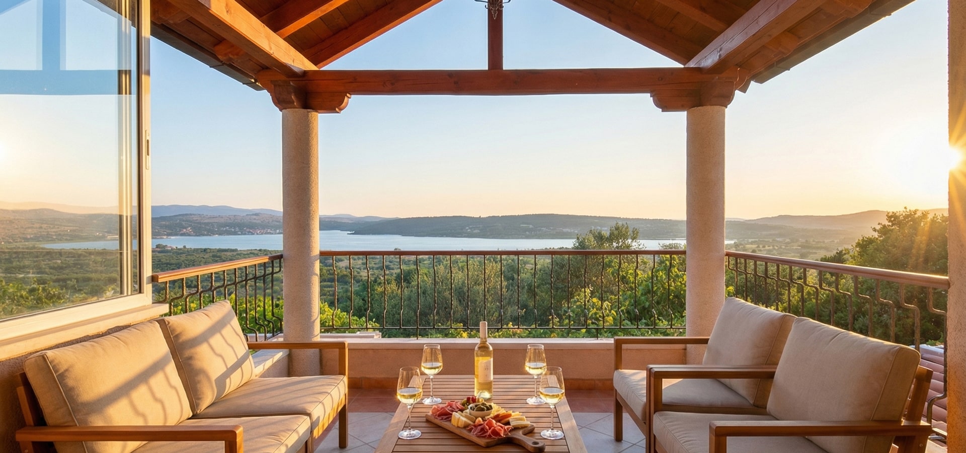 Ihr wacht auf, öffnet die Terrassentür und hört – nichts. Nur das Zwitschern der Vögel. Vor euch weite Felder mit Olivenbäumen und in der Ferne glitzert das Meer in der Morgensonne. Ein Sprung in den beheizten Pool, Frühstück im Garten, später in die historische Altstadt von Šibenik, zu den schönsten Stränden und Buchten Kroatiens, den Krka-Wasserfällen oder ein Tagesausflug zu den Kornaten, nach Split, Trogir oder Zadar – und abends stoßt ihr gemeinsam bei einem Glas Wein auf der Terrasse an, während die Sonne im Meer versinkt.